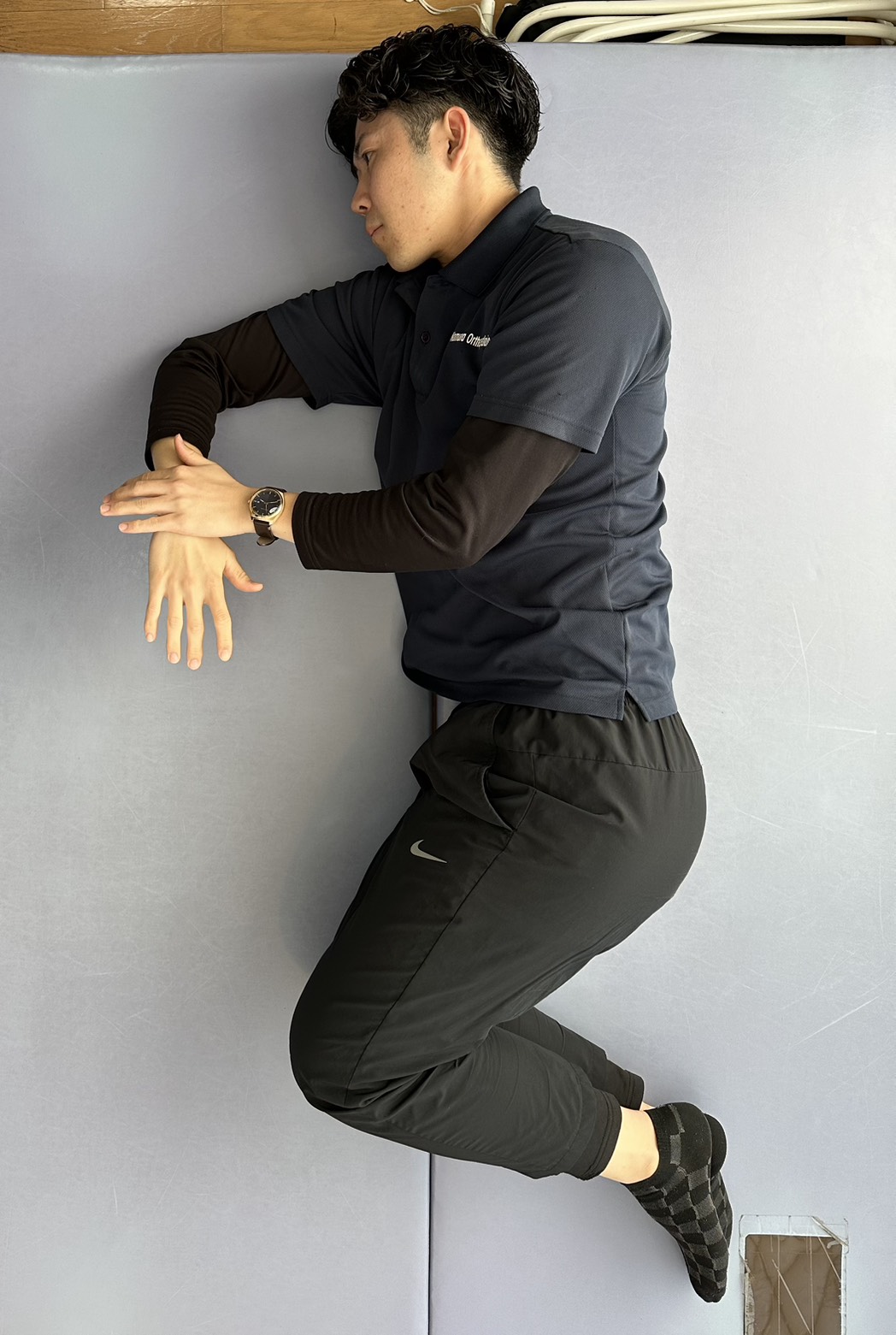 2.肩甲骨を軽く寄せます(体側につけた肘を少し後ろに引き、胸を張る)