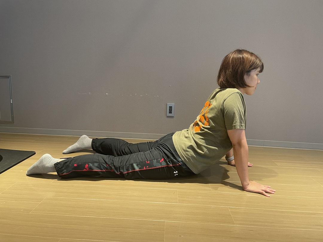 - 両手で身体を支えながら、ゆっくり上体を上げて伸ばしていきます。