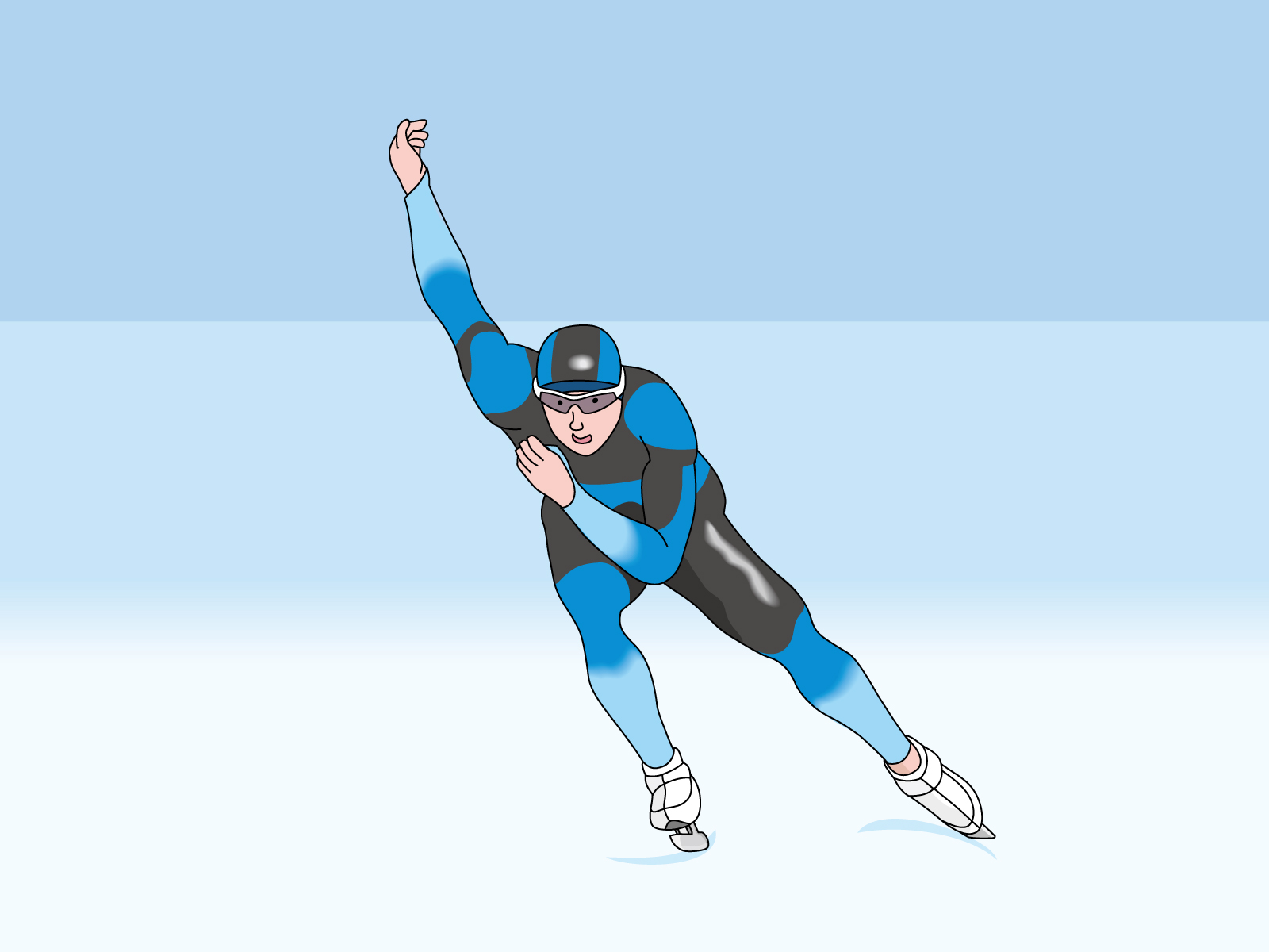 スピードスケートの滑走フォームは、空気抵抗を極力抑えるため、可能な限りの前傾姿勢をとっています。