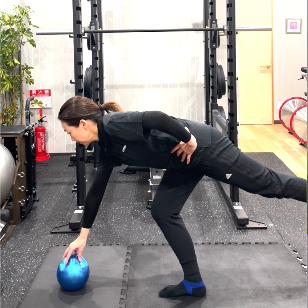 - 片足で股関節と膝をしっかり曲げながら前にあるボールを取りにいきます。