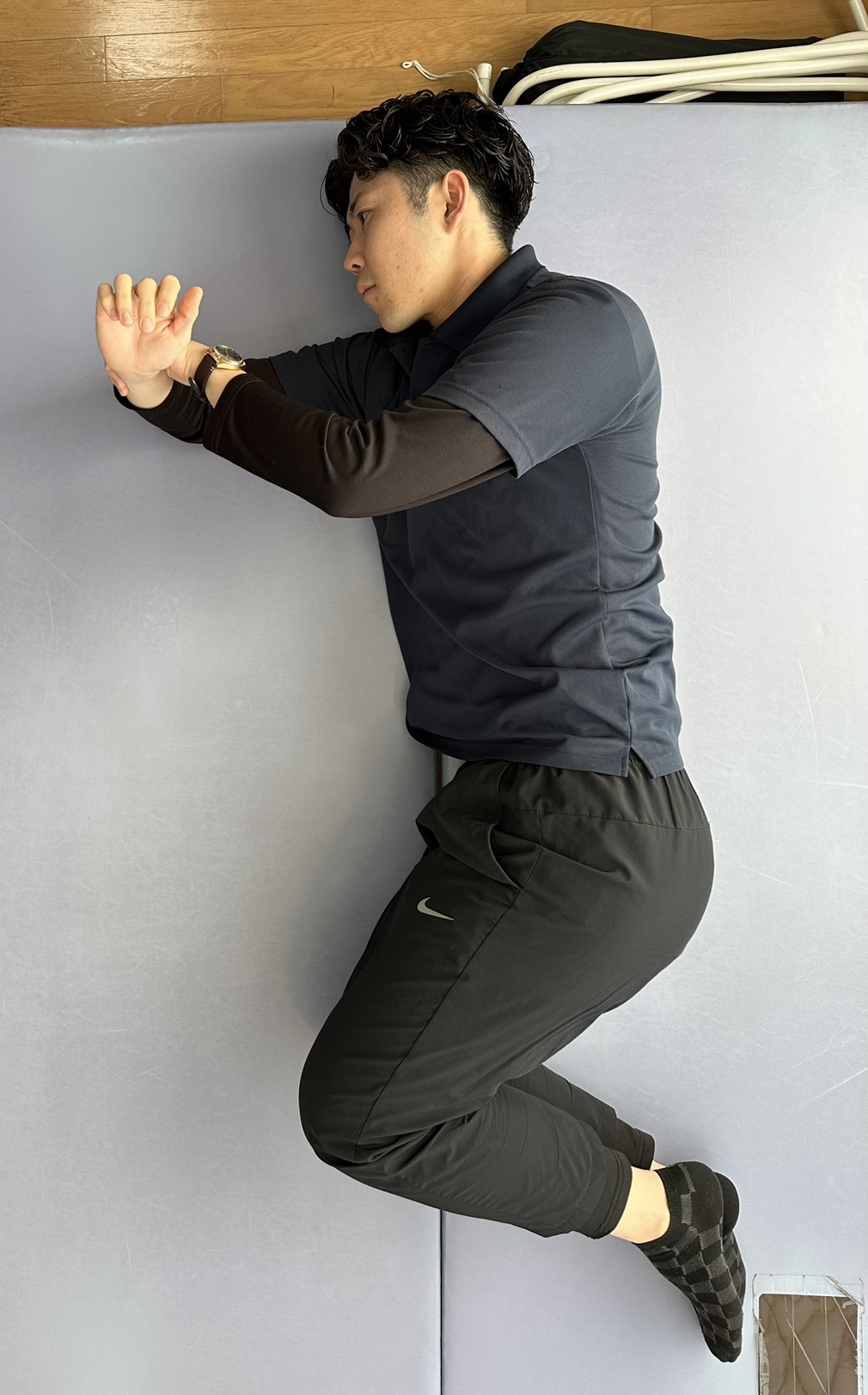 2.肩甲骨を軽く寄せます(体側につけた肘を少し後ろに引き、胸を張る)